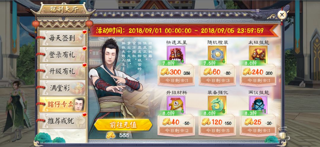 瞎仔专卖再次来临,9月1日更新后-9月5日23:59期间开启。更多实用道具加入折扣商店,大灵宝,金大仙等超值道具,最低低至7.5折,限量出售!