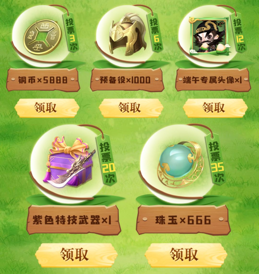 活动期间,投票数量到达指定数量,即可领取铜币*5888、预备役*1000、端午专属头像*1、紫色特技武器、珠玉*666(单账号所有奖励仅可领取一次)等奖励。