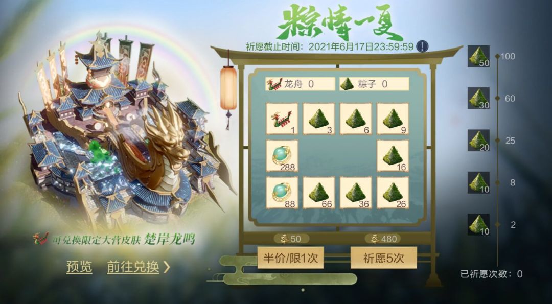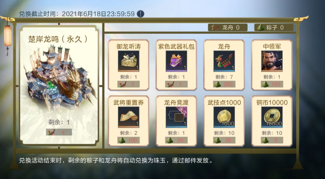 祈愿得到的粽子和龙舟,可用于在粽情商店中兑换称号【御龙听涛】、中领军、紫色武器礼包、武将重置券等奖励,更有全新大营外观【楚岸龙鸣】(永久)等着你哦~