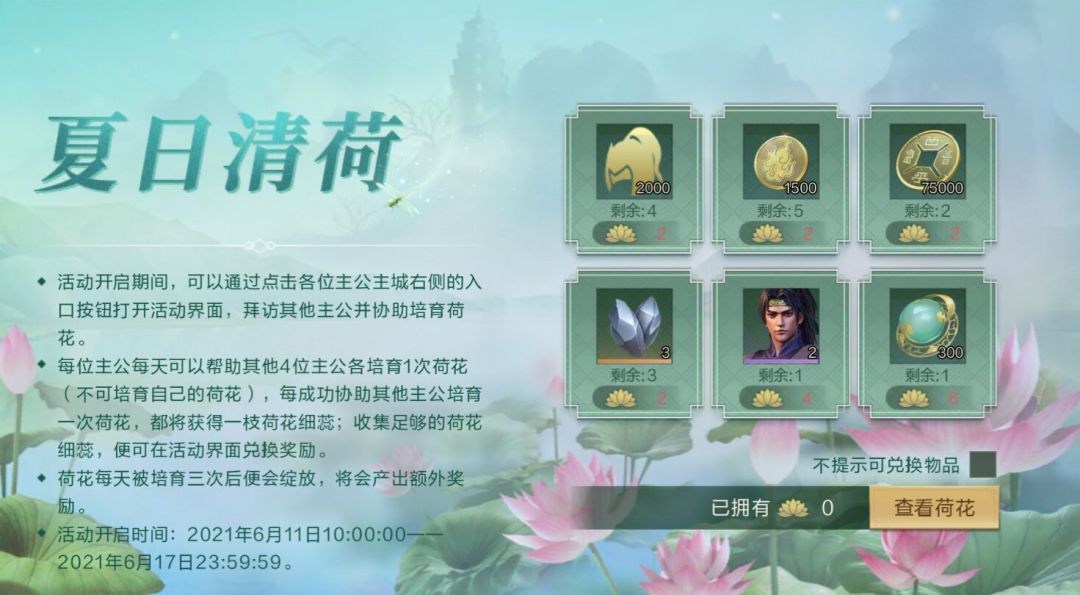 每成功协助其他主公培育一次荷花,都将获得一枝荷花细蕊;收集足够的荷花细蕊,便可在活动界面兑换预备役*2000、武技点*1500、铜币*75000、精铁*3、中护军*2、珠玉*300等奖励;