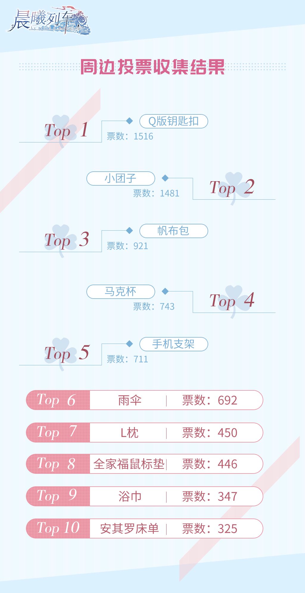 感谢大家在周边投票活动中的热情参与,以下是截止昨日周边投票的排名结果!