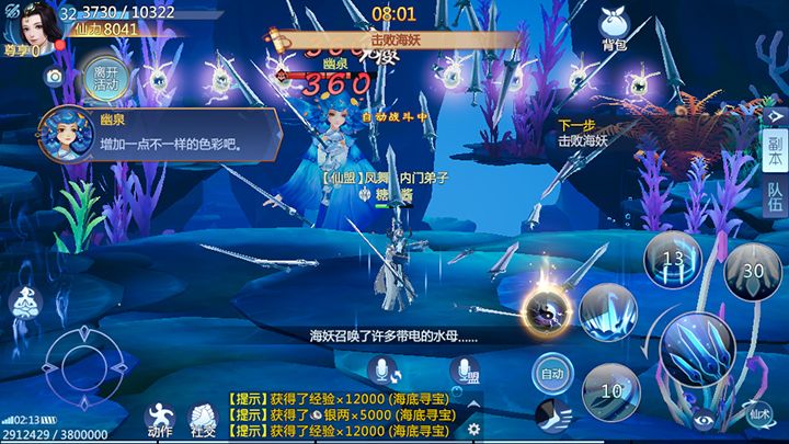 修仙类的手游怎么能没有冒险呢?单人冒险活动中就属东海秘藏最为有趣啦!参加这个活动会进入海底世界,在这里玩家需要通过传送阵到达不同的地方,击败小怪或BOSS,开启宝箱获得奖励。活动时间为十分钟,传送阵每次出现的地方和数量都不同,玩家需要根据自己的直觉进行选择,运气好的话会遇到许多的宝箱,而运气不好的话,可能会遇到大海妖哦!反正本大侠每次都会倒霉的遇到大海妖,不过每次海妖都打不过本大侠就是啦!传送阵一共会出现四次,最后一次传送后,不管时间有没有用完,活动都会结束。相应的如果玩家因为打海妖而耽搁了时间,当时间耗尽时也会结束哦!所以提升自身的实力才是通关的关键哟!