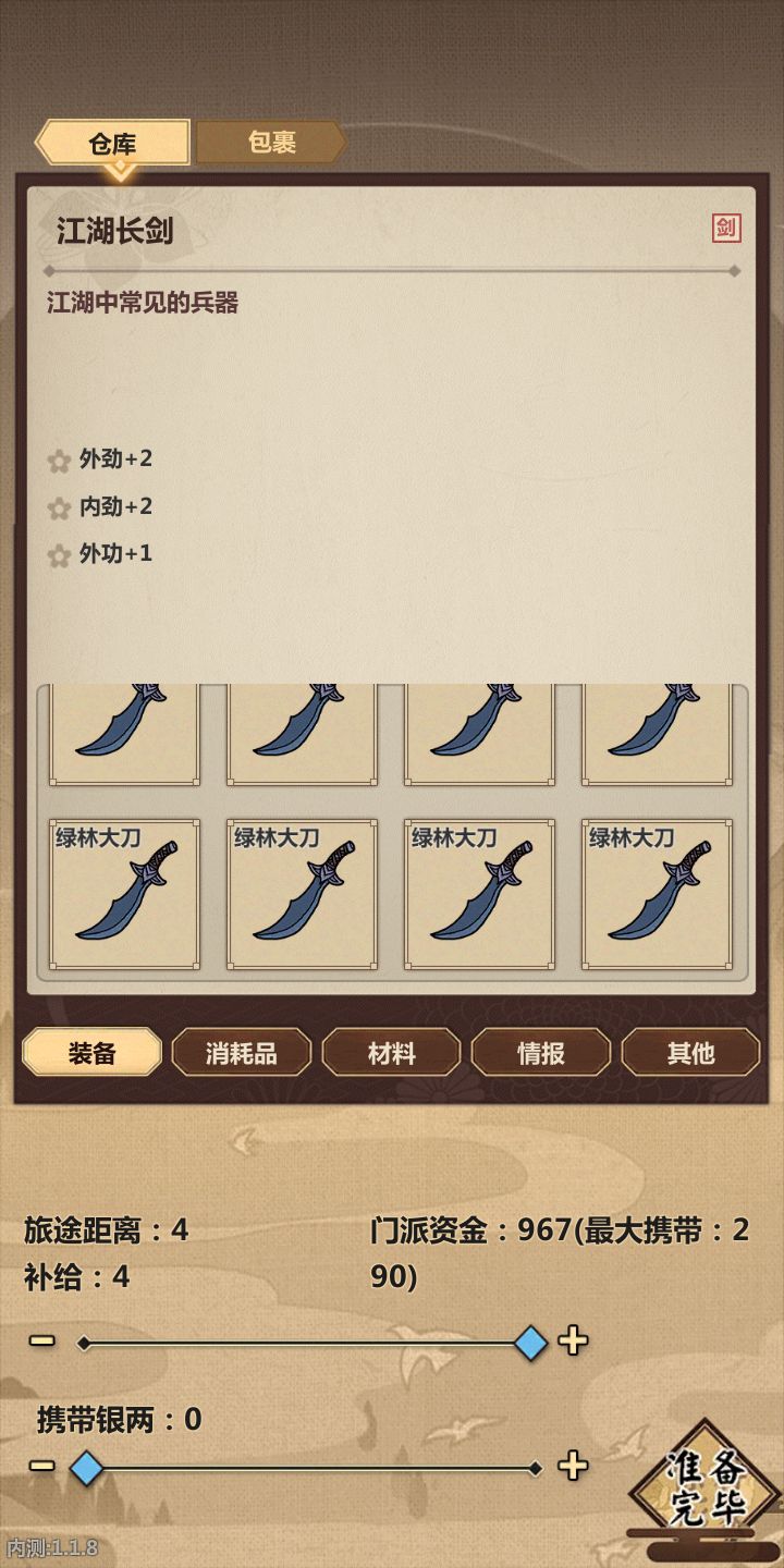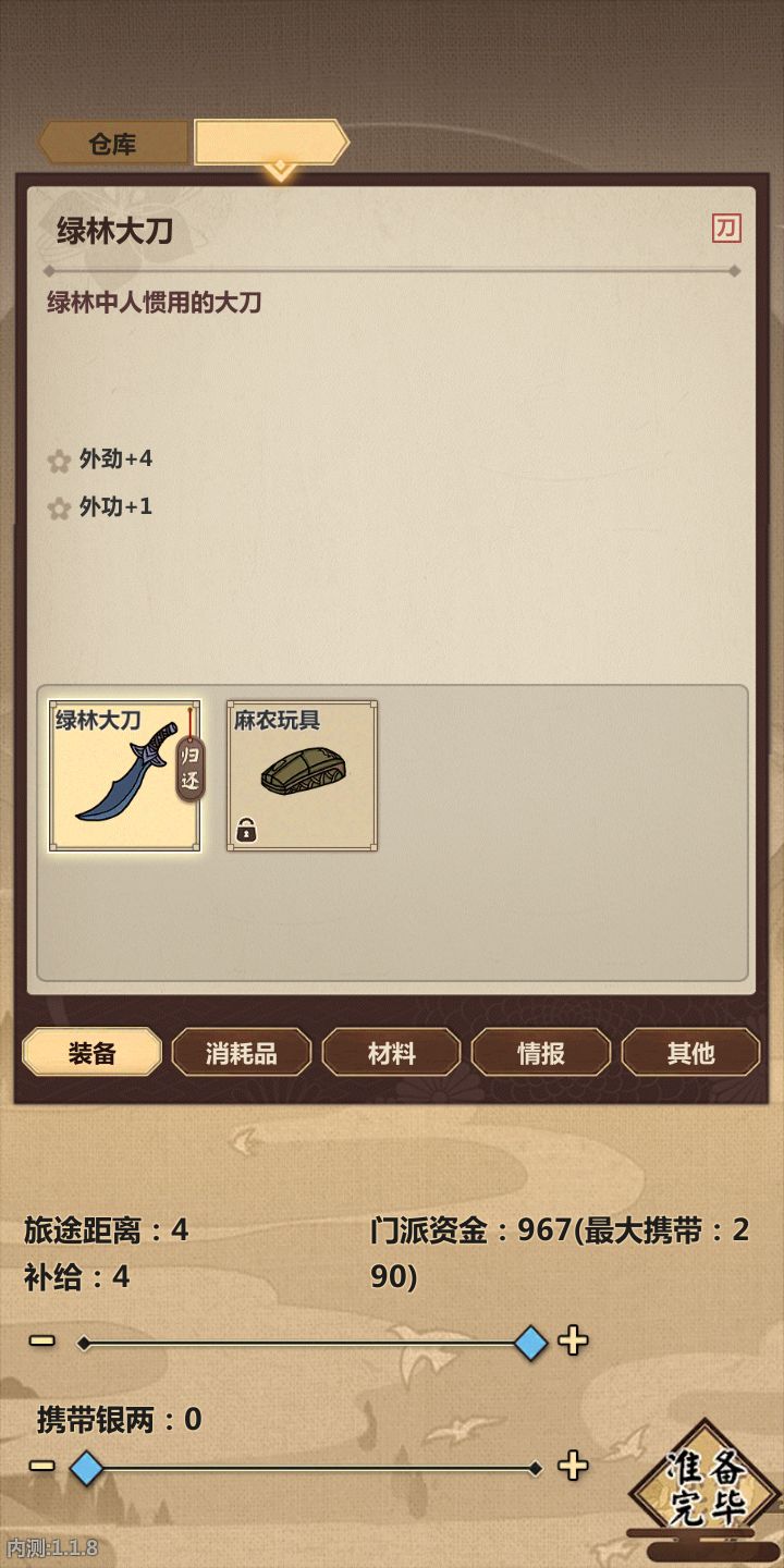 追击第三个门派叛徒时候,在远行界面我背包有个刀一直归还能无限刷。