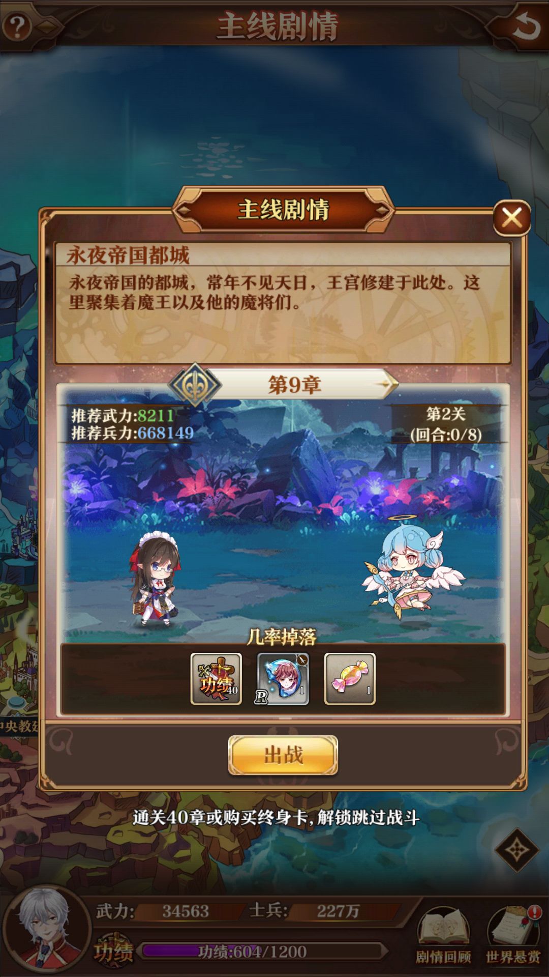 实测我10W战斗力刚好能首次通关,之后一键推关就需要对应战斗力了哦