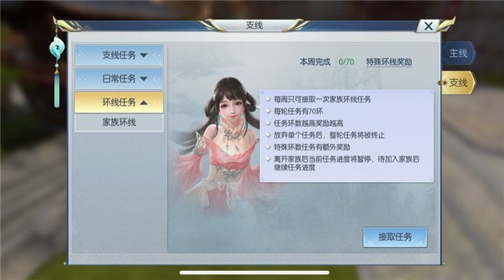 每周只可接取一次家族环线任务,每轮任务有70环,放弃单个任务后,整轮任务将被终止。特殊环数任务可以获得额外奖励。离开家族后当前任务进度将暂停,待加入家族后继续任务进度。
