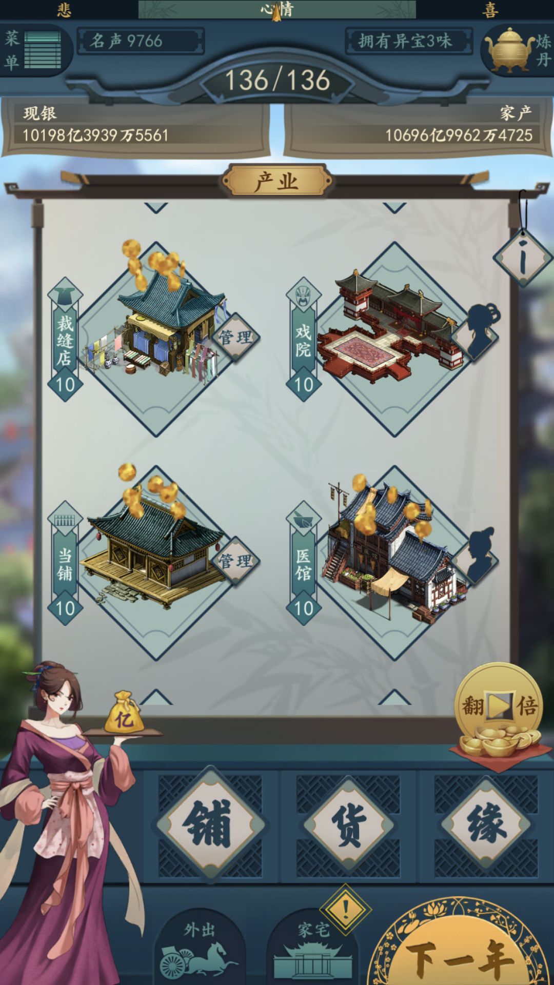 节奏很重要!记得第一步先买银行,接着去刷新5次知己,是为了刷出小家碧玉(主要是为了和离打基础),然后再买店铺