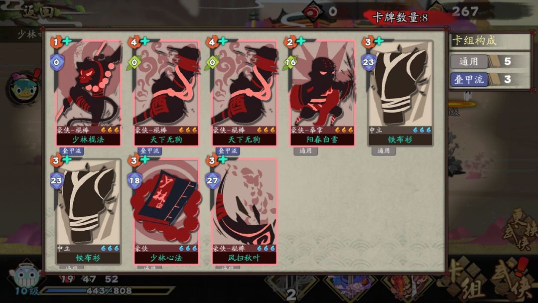 卡牌:效率第一,舍弃猴戏堆防,利用将军套获得高启动护甲,少林棍叠甲快速击杀。成型牌如下(多布甲/双七公棍用于对抗弃牌词缀和删卡兵),书用来抓取输出或者叠甲核心,低总牌数保证任何情况必定能拿到想要的牌,打狗弃1删1也能用书抓回来弃掉那张(8张还不是拿脚过牌)