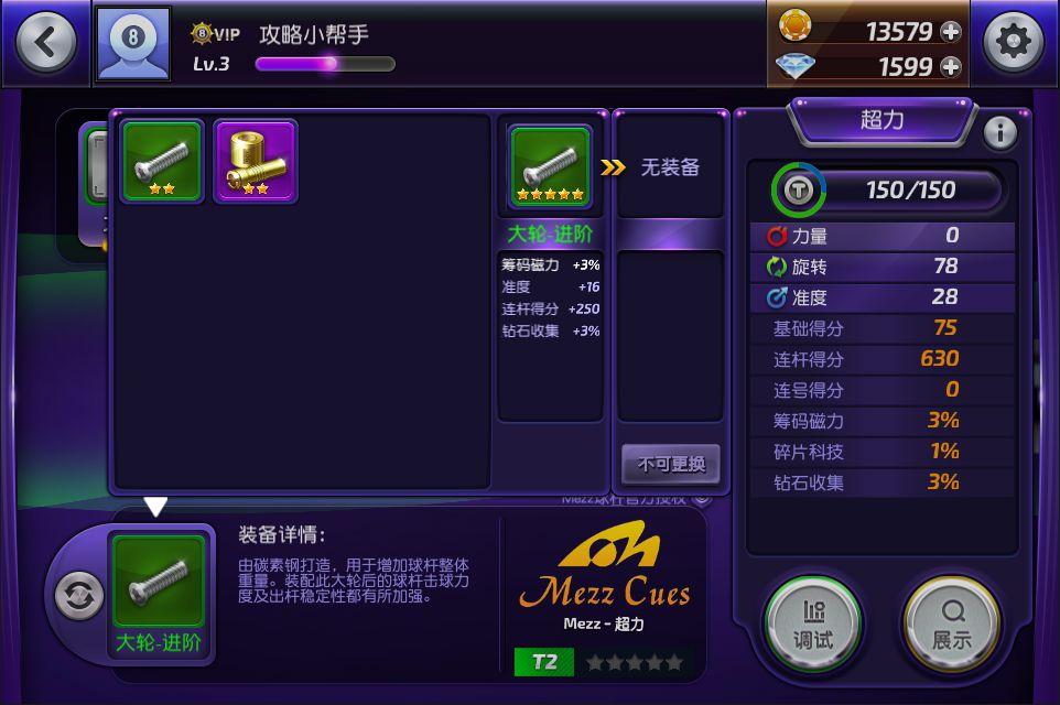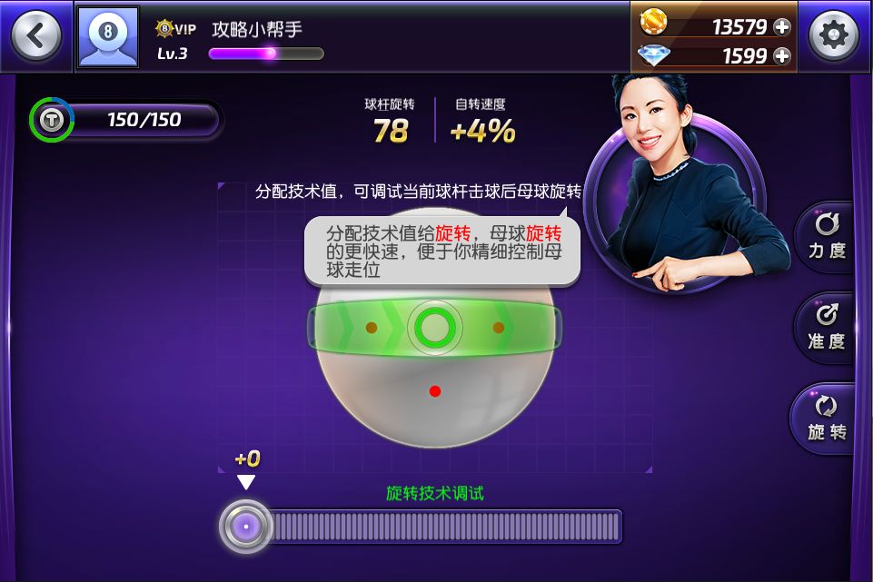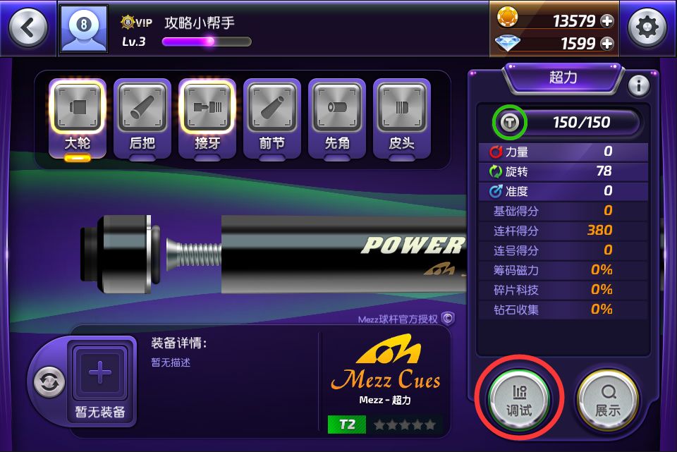 在有可分配的科技值的情况下,可以在调试界面分配科技值给到球杆的三个主属性(力度、准度、加塞)上,增加相应的能力值。