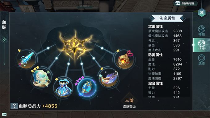 不同类型的法宝基础属性不同,攻击法宝、护体法宝和穿梭法宝提升最大、最小魔法/物理攻击,护道法宝提升物理、魔法防御,洞天法宝提升生命和魔法值,本命法宝提升暴击和生命值。