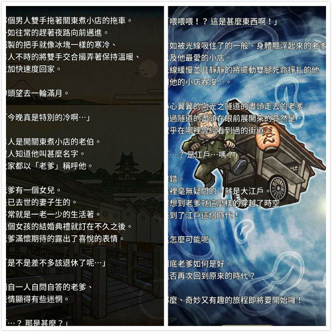 故事的开端,是从一位关东煮老伯的奇遇开始:夜归的老伯被一个奇异的光球吸走,转眼之间就穿越到繁华而梦幻的大江户时代。于是,江户时代那浮世绘一般的生活,在老伯的关东煮小店中徐徐展开。