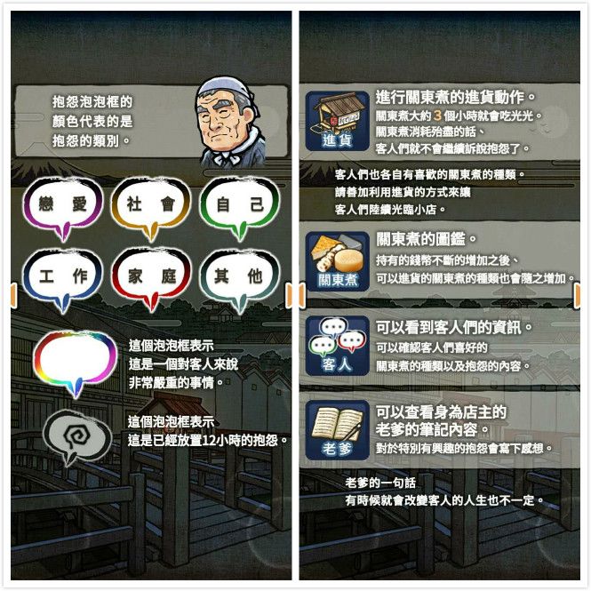 《关东煮店人情故事2》是一款有温度的游戏。与其说是一个游戏,不如说更像是一本故事书。随着游戏的进展,在一句又一句的抱怨中慢慢拼凑起顾客所经历的人生。看顾客在闲聊之间,为你娓娓道来一个又一个故事。