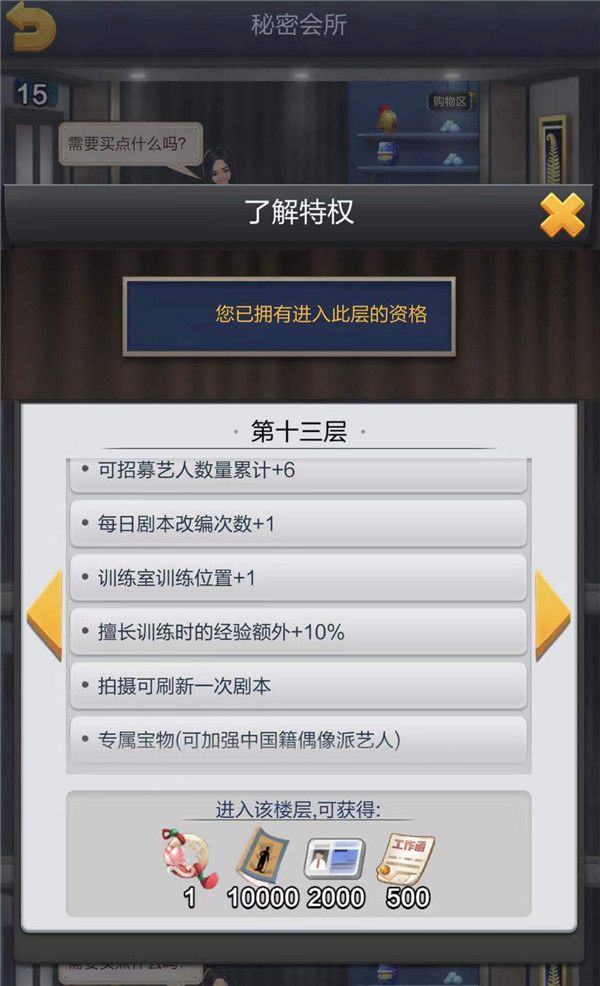除了以上的六个特权之外,达到第十三层会所的玩家朋友,还将会自动获得系统赠送的擅长卡10000张,培养卡2000张以及工作簿500张。