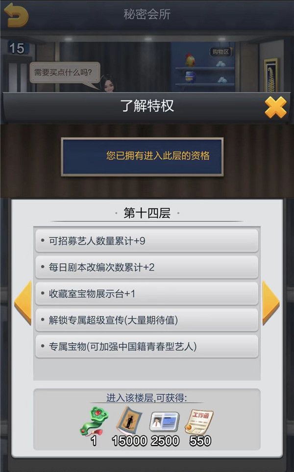 到达会所十四层的玩家朋友,每天允许有一次机会花费50钻石,进行全年宣传,额外获取300期待值的加成。众所周知,期待值的高低直接对总票房的多少产生着影响,因此每日能比普通玩家多获取300期待值,着实让追求至尊榜排名的土豪玩家欣喜若狂。