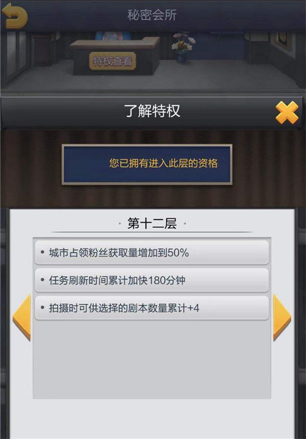相比于第十、十一层会所为大家带来的强力特权,第十二层会所的性价比似乎并没有那么高,其中特权所带来的效果,Chen在之前的攻略中也已经详细进行了介绍。下一期的攻略中,Chen将为大家带来终于“土豪”特权,那些全身心投入游戏的玩家朋友,千万不要错过了喔~