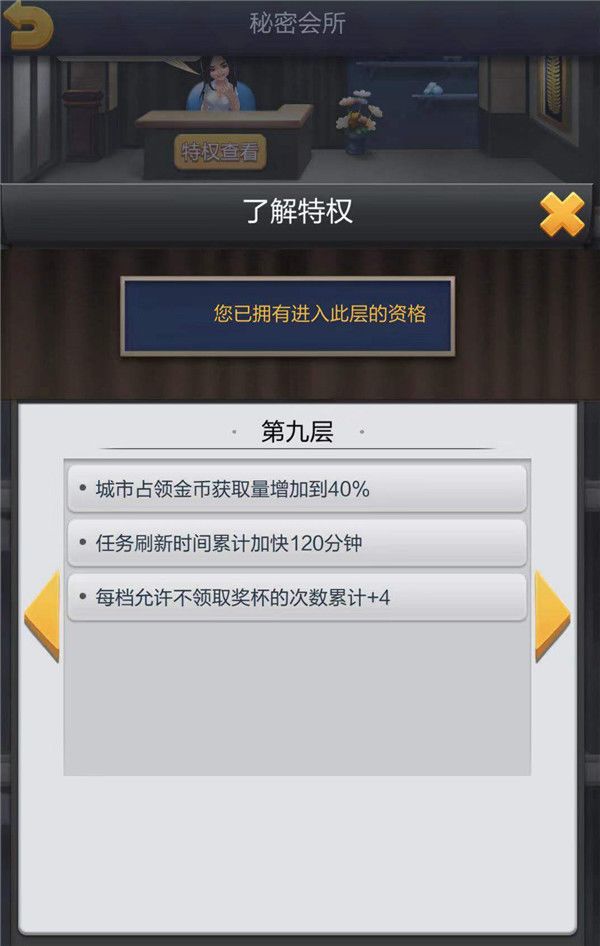 相信仔细阅读过之前两篇攻略的玩家朋友们在看到第九级会所特权的时候并不陌生,并且能够在脑海里第一时间Get到所有的特权所能够带来的效果,在这里Chen就不再反复赘述了。