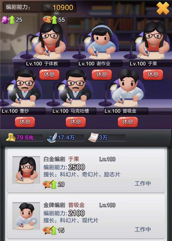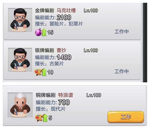 不难看出,多一个金牌编剧能够为我们的总编剧值带来额外700数值(满级)的加成。让我们的拍摄能力,票房水平得到一个质的飞跃。