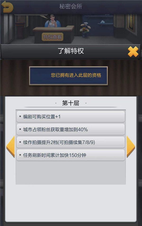 那么回到第十层特权的“编剧可购买位置+1”上来,多买一个编剧,无论是银编剧还是铜编剧,都可以有效的提升总编剧值,让编剧的能力达到各个分水岭。这也是为什么很多会所等级高的玩家朋友能够较为容易去的传奇/神话票房的本质原因。