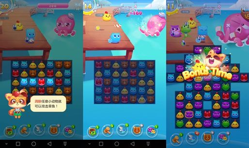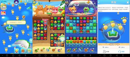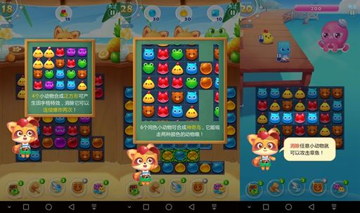 游戏是用三消换位的操作方式,相比当下流行的连线消除和点击消除要有难度提升,但是传统的消除方式对玩家的考验也是有的,而且可以让玩家们在游戏中更有锻炼自己眼力和思考能力,由于游戏是以休闲为主,所以并未做时间限制,可以给忘记充分思考和观察时间,但是行动步数是限制的。而且游戏提供了众多的模式给玩家们,包括消灭小鱼任务,收集水果任务,收集公仔任务,击退boss任务等等任务非常丰富多彩而且配合特有的背景音乐和音效让游戏更加有趣。