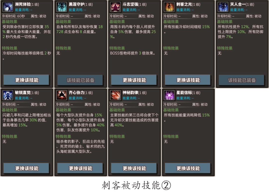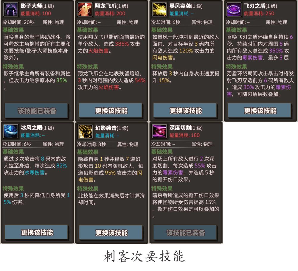 本游戏的装备技能太多,很多萌新无法得知跨职业技能的状态,固整理出刺客技能提供给需要的人,同时欢迎玩家分享其他职业的技能说明。