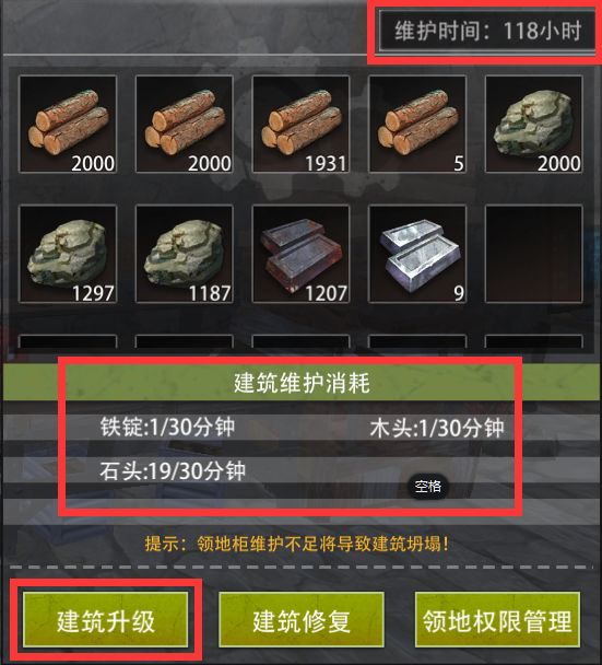 4、领地柜领地柜里需要放入维护材料,否则房屋会逐渐坍塌直至消失,我们亲切得称之为“交房租”;门、地基、天花板、墙壁使用越多,房租就越贵,前期不建议萌新造太大的房子给自己增加负担;升级领地柜,可以把房屋从木质,变成石制→铁制→钢制,建筑的耐久会增加,小偷需要更多的炸药才能闯进你家,安全等级UPUPUP,当然升级后房租也会提升。