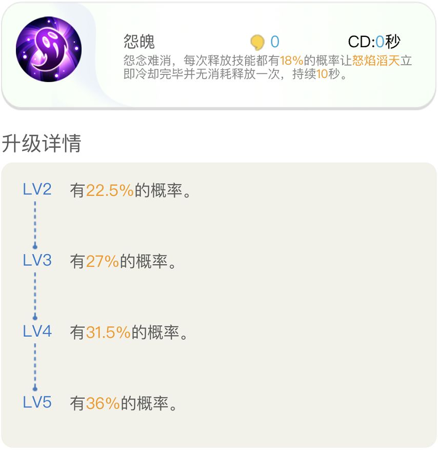 怨念难消,每次释放技能都有18%的概率让【怒焰滔天】立即冷却完毕并无消耗释放一次,持续10秒。