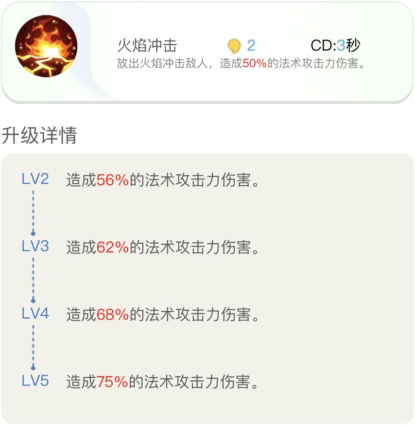 【5费起手】:2【怒焰滔天】(5费)->1【火焰冲击】(2豆)