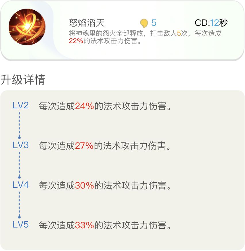 将神魂里的怨火全部释放,打击敌人5次,每次造成22%的法术攻击力伤害。