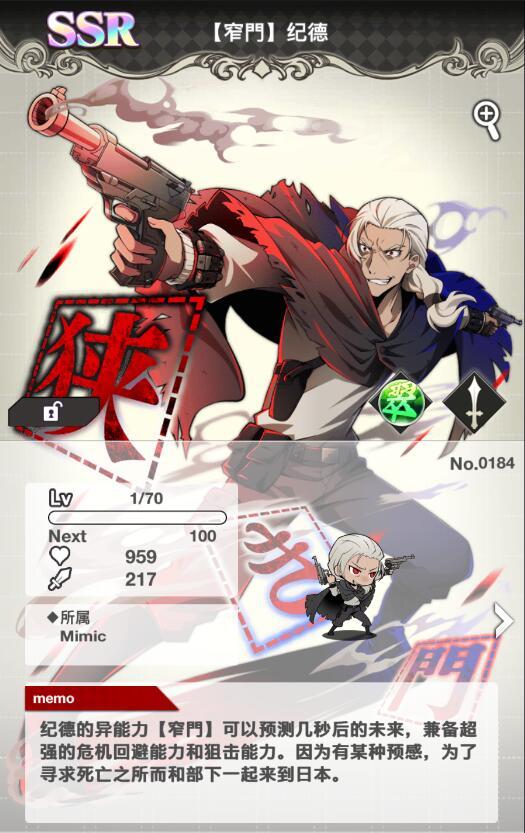 纪德的异能力【窄門】可以预测几秒后的未来,兼备超强的危机回避能力和狙击能力。因为有某种预感,为了寻求死亡之所而和部下一起来到日本。