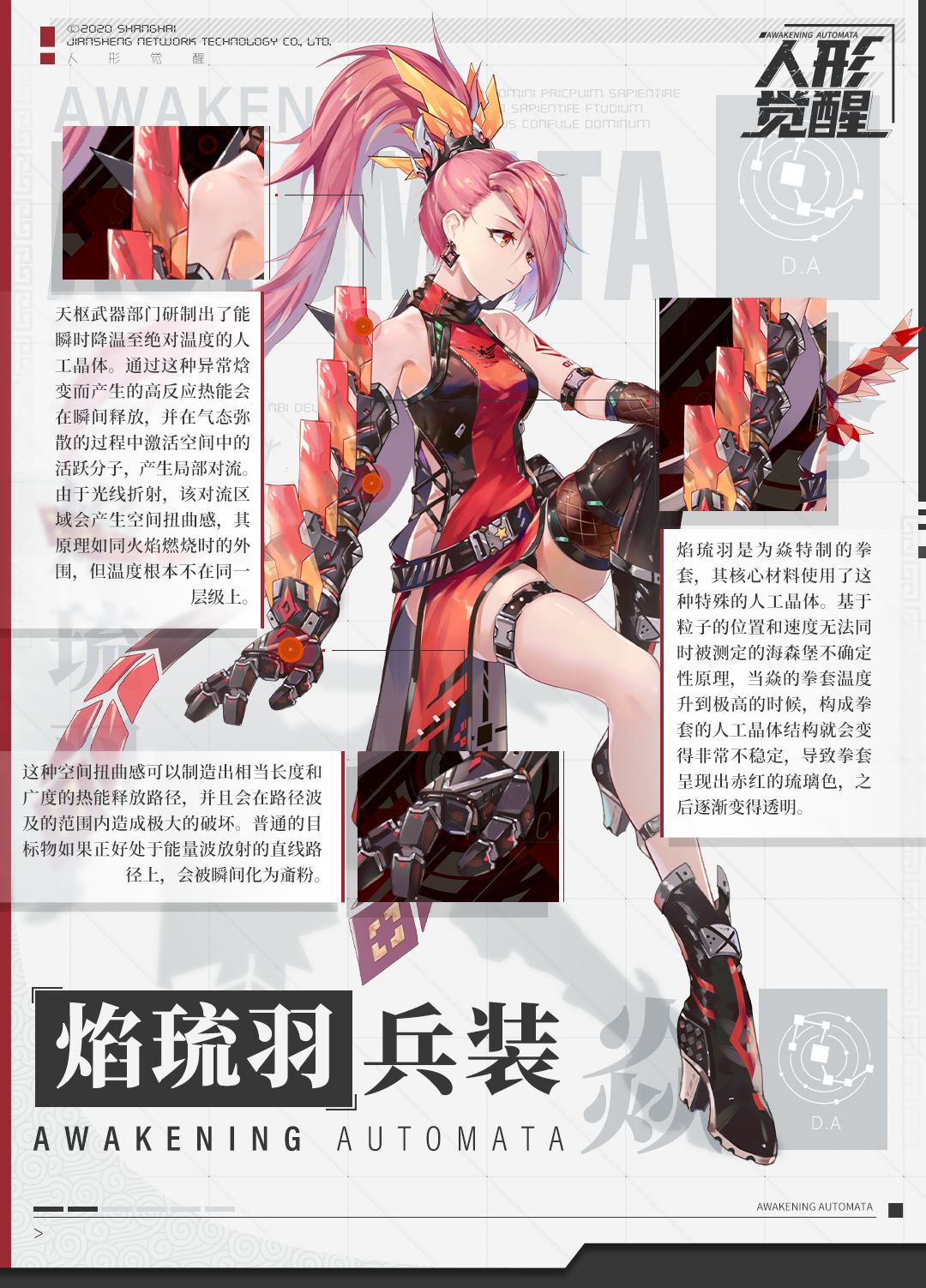 焰琉羽,为焱特制的拳套,其核心材料使用了特殊的人工晶体,能通过异常焓变产生高反应热能,并在释放路径波及的范围内造成极大的破坏,帮助焱更好地消灭目标。