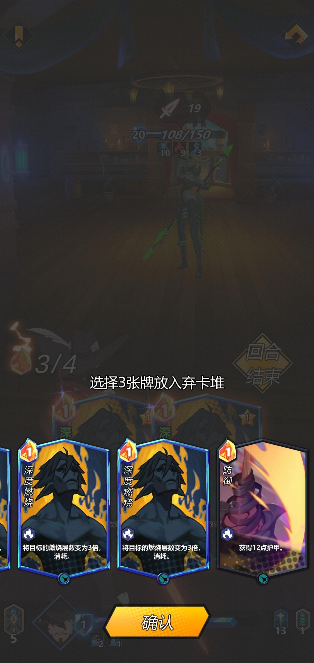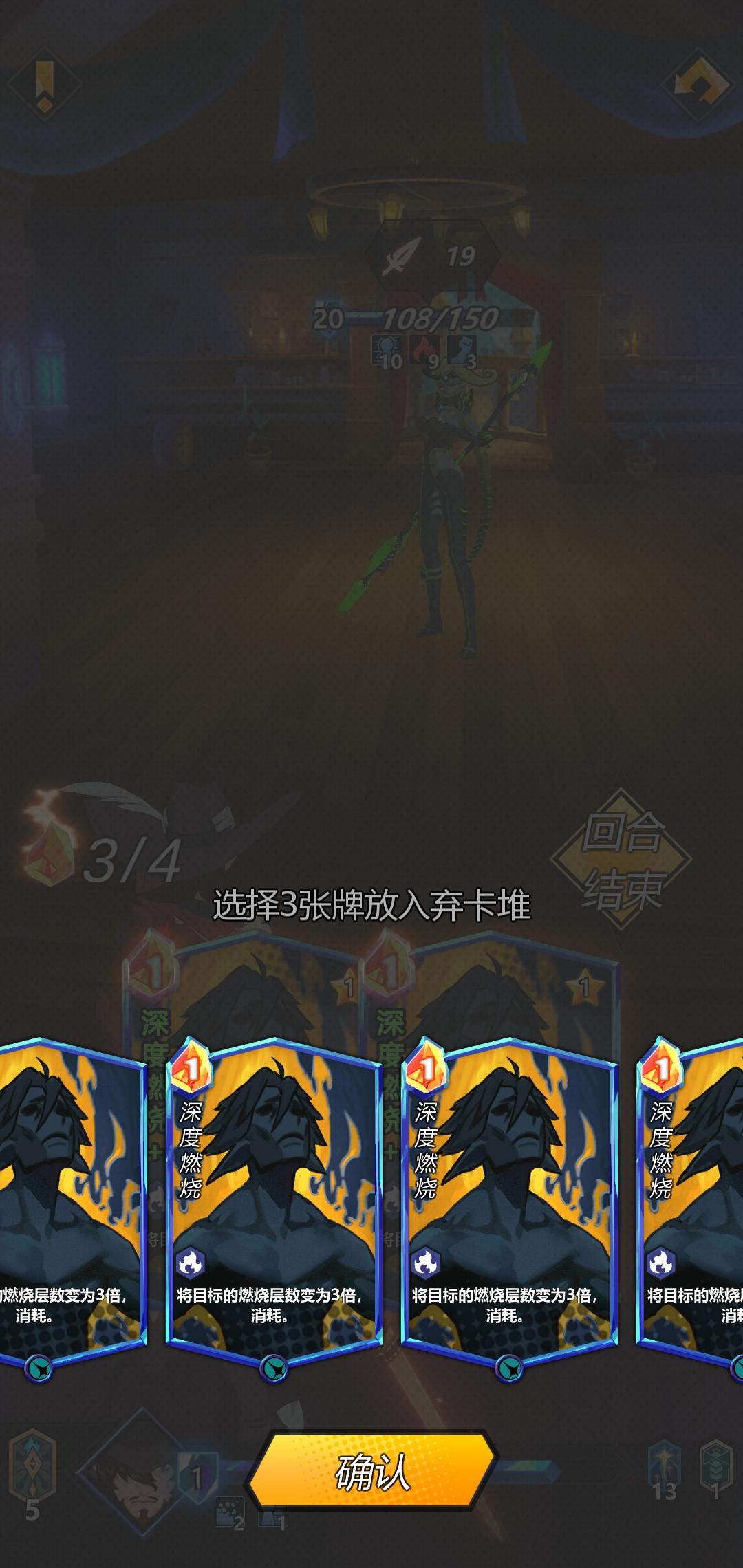 退出重进,剩下2深度燃烧+1防御+1整备,依然提示丢牌,丢了防御和整备,继续提示请选择,之后再退出重进,4个深度+1防御,丢了1深度+1防御,出来就空手了。