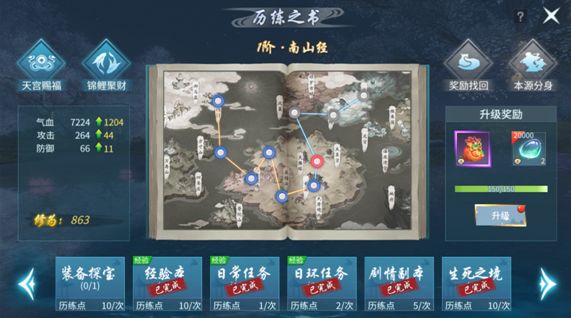 【历练】-通过完成历练任务;增加升级值可获得丰富的元石及额外奖励。