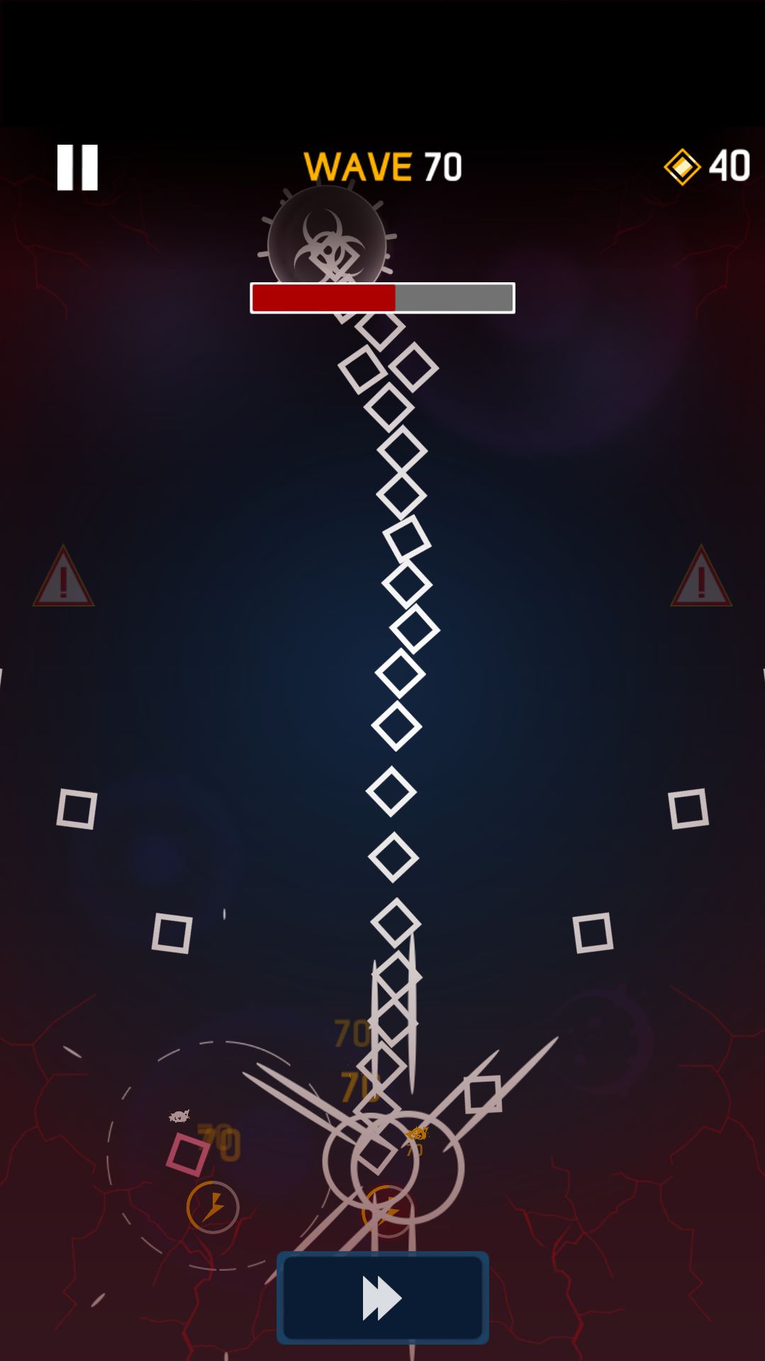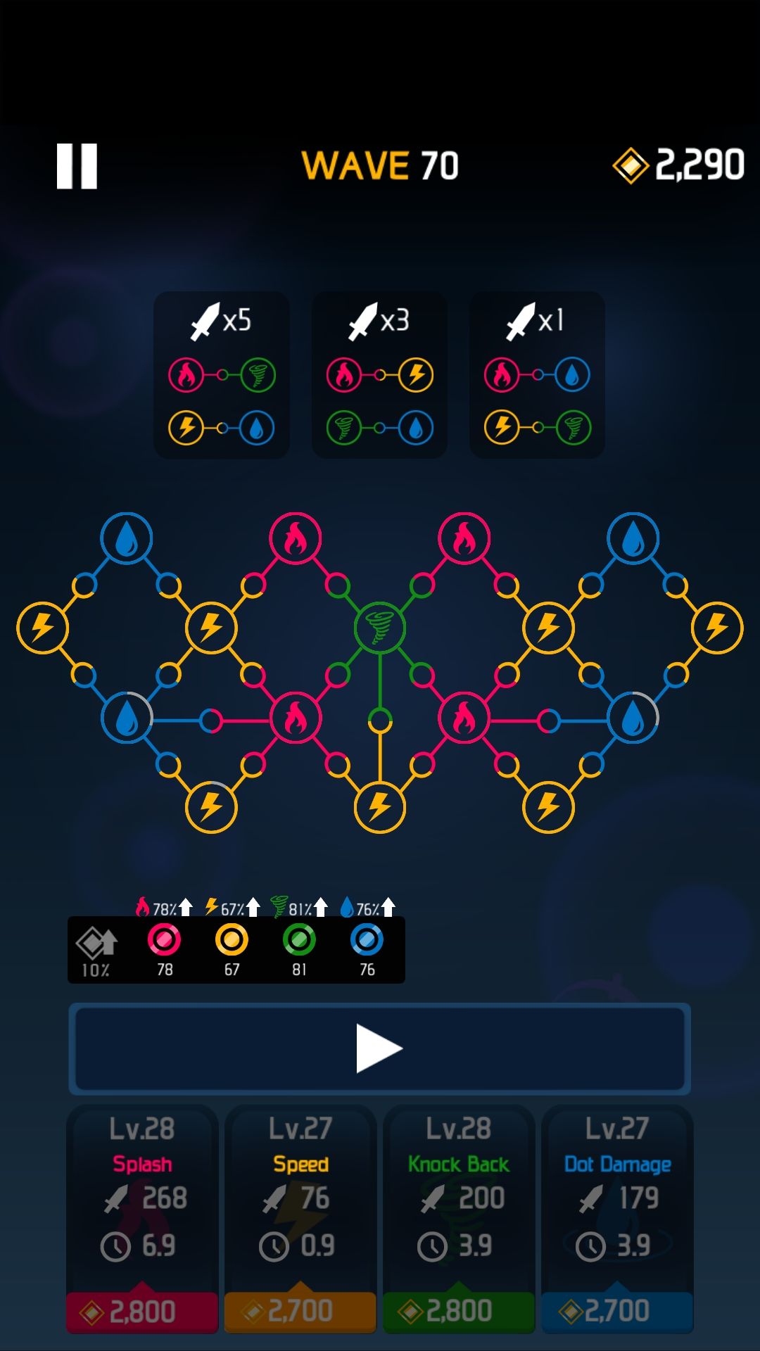 什么?你说这个和上面那个有什么差别?当然有啦,这个阵型的核心就是绿色+红色产生的高伤害攻击,而红色旁边的黄色由于其快速的原因所产生的“黄红”也具有较快发射,飞行速度较快的特点,为“红绿”清空前方障碍,直达boos,这也是对付50和60关boos的最佳阵型之一,因为在50关之后的boos,最危险的不是侧面飞出来子弹,而是boos间歇性喷射出的大量子弹,如果不集中伤害是过不去的!