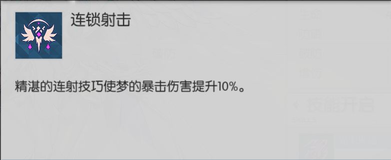 连锁射击(效果):精湛的连射技巧使梦的暴击伤害提升10%。