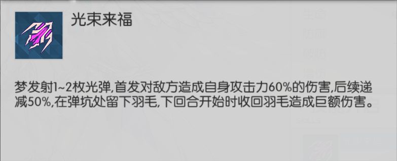 光束来福(普攻):梦发射1~2枚光弹,首发对敌方造成自身攻击力60%的伤害,后续递减50%,在弹坑处留下羽毛,下回合开始时收回羽毛造成巨额伤害。