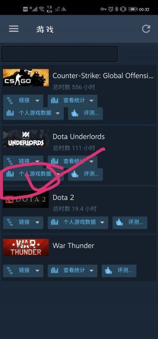 在steam手机端打开游戏库,点击个人数据即可进入以下页面。(pc端大概是在个人里面)