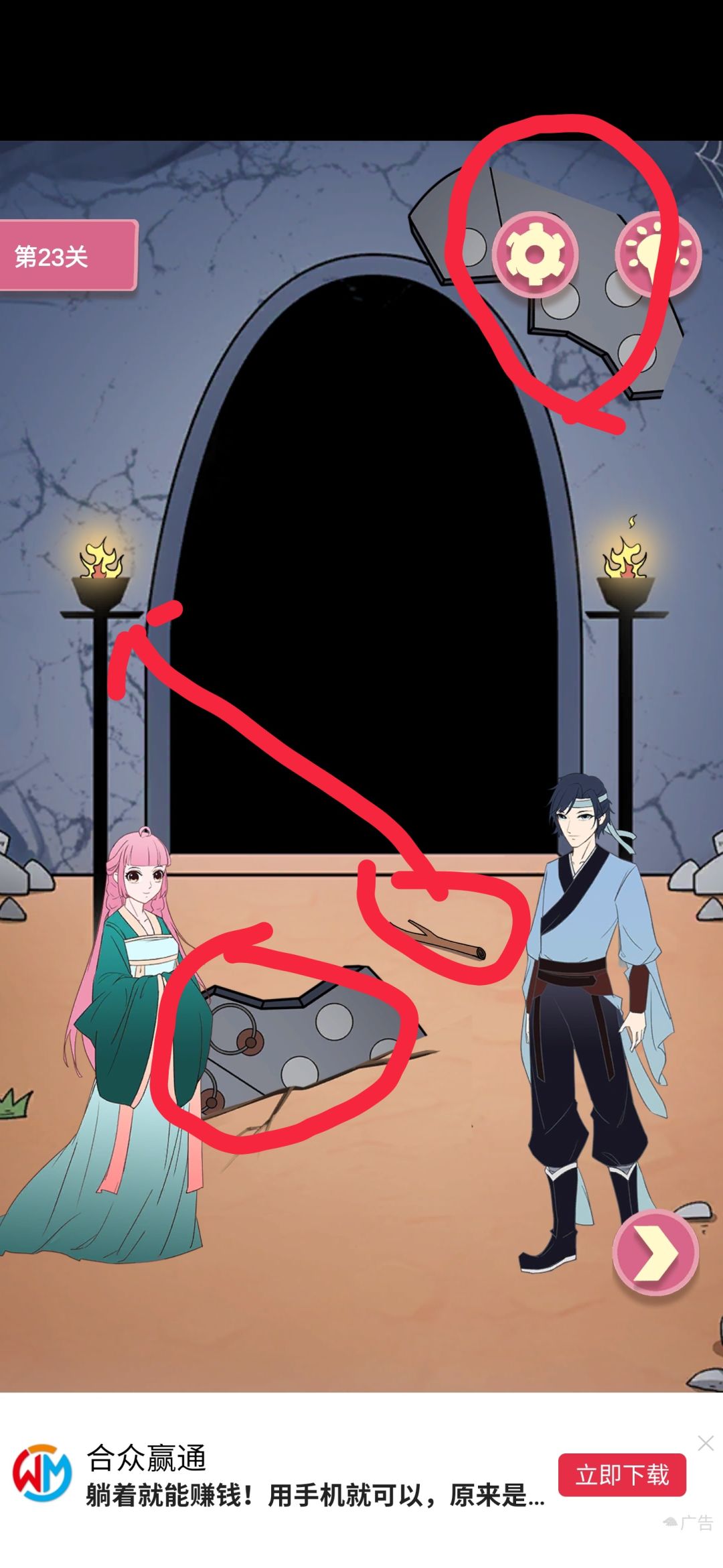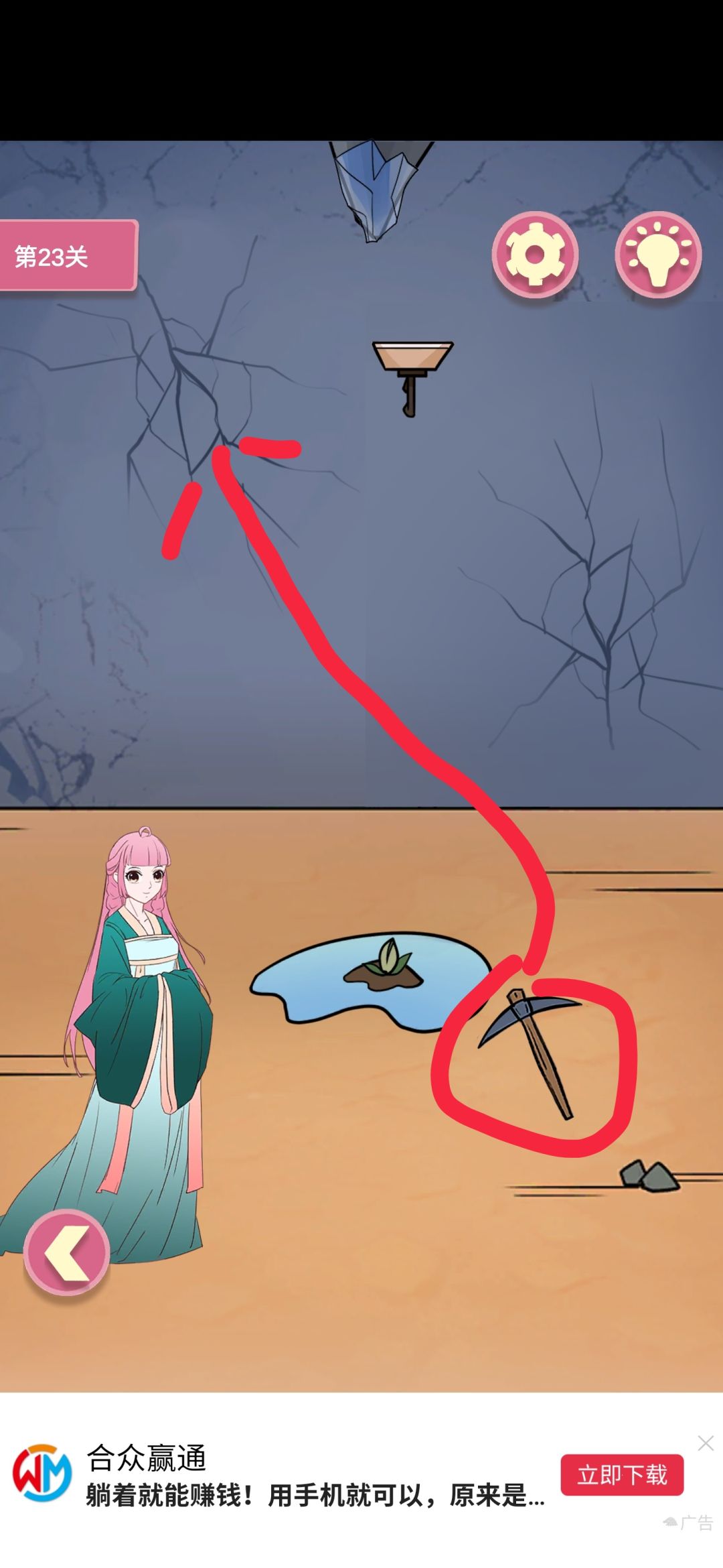 拼好门过关。二十四:点红色警报按钮,点空白图画。废话:这作比前两作简单,就算是我不看攻略也能玩儿通,当然广告看了三四个,这作个人认为比前两作好玩,有了立绘,剧情性也强了很多,并且算是男女主一起冒险的故事,前两作都是女追男且是个人感觉有点舔狗的追,所以更喜欢这作,虽然感觉大家不需要但难得赶上没攻略又比较简单自己能玩儿通的游戏,就写了个攻略,就当方便大家不去看广告了吧,虽然搜个攻略比看二十多秒广告时间长,但绝大多数人(包括我)就是喜欢搜攻略也不肯看广告的。