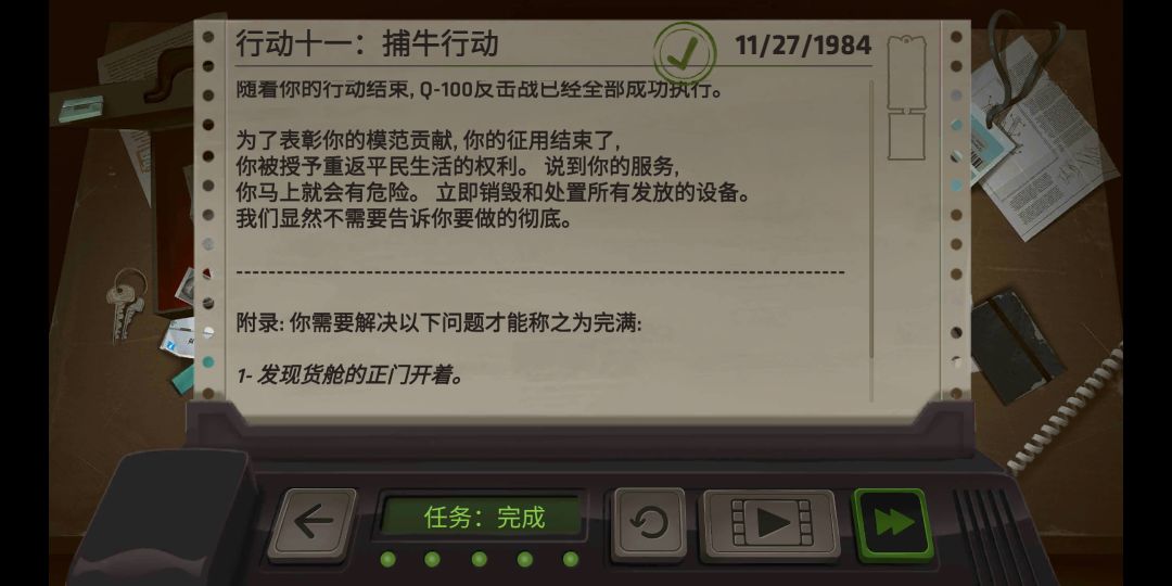 16、把控制室的门用钥匙锁上,门关上,到第五车厢用钥匙把门锁上,把抹布还给酒保,把记名册,漂白水,笔,还给乘务员,把药片,钱,帽子放回旅行包,把书给老人,去车顶扔钥匙。(来自大佬的改正)