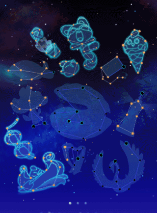 从游戏界面上方下滑,可以切换到“星系层”,这里有海滨星球专属的各大星座图案。每个星座图案由不同数量的“蓝星”组成;通过闯专属蓝星关,可以获得额外蓝星,从而组成不同的星座图案,还可以获得不同的豪华道具等奖励。