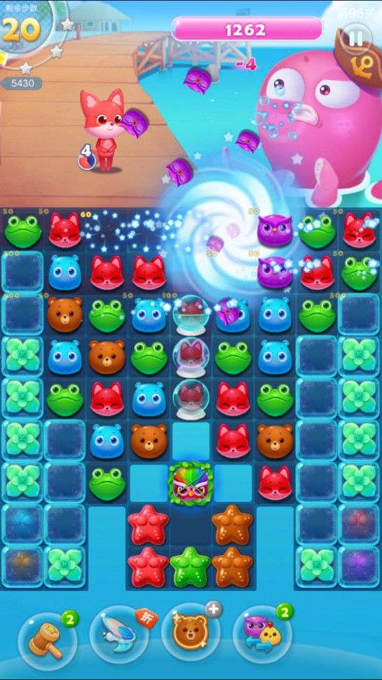 在章鱼关卡中,会在游戏界面上方出现两大派系,一边是萌宠天团组成的“正义派”,一边是章鱼大boss孤军奋战的“邪恶派”(长了一张天然欠揍脸)。通过消除面板内的元素和冰块等障碍,为上方的正义派小动物们积攒能量;当能量条集满,从而释放大招,攻打章鱼boss,看到坏章鱼被爆打,简直是爽到爆啊有木有!