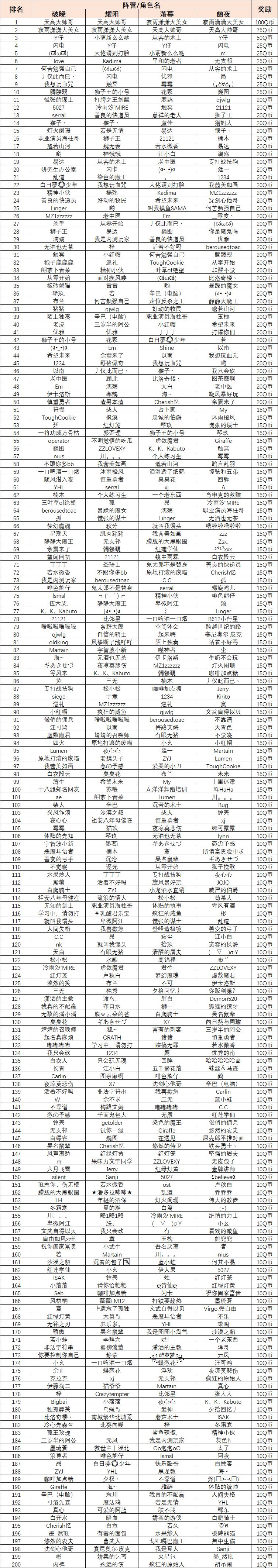 截止时间12月4日14:00,全服天梯榜四个阵营排名前200名的玩家名单如下: