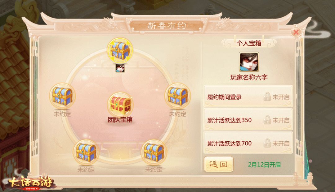 与子同袍,定不负卿。在《大话西游》手游中和大家最为亲密的,是一起作战的好兄弟们,同甘共苦共度一年,到了春节自然也应该共享欢乐,相约新春,一同赢取新春好礼啦!1月30日-2月5日,3人及以上组队前往新春使者处进行新春约定,众人一起完成登录及活跃度要求之后,就可获得个人宝箱,更能共同开启团队奖励!龙之骨,终极技能残卷,神兽属性卡,荒玉等新春好礼等你和兄弟们一起分享哦!