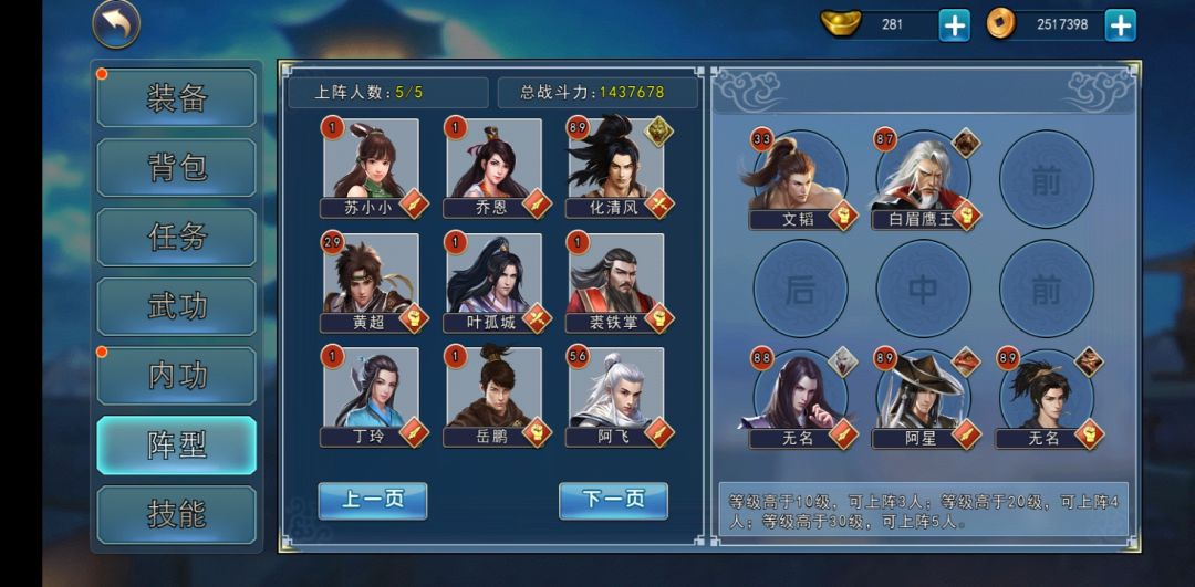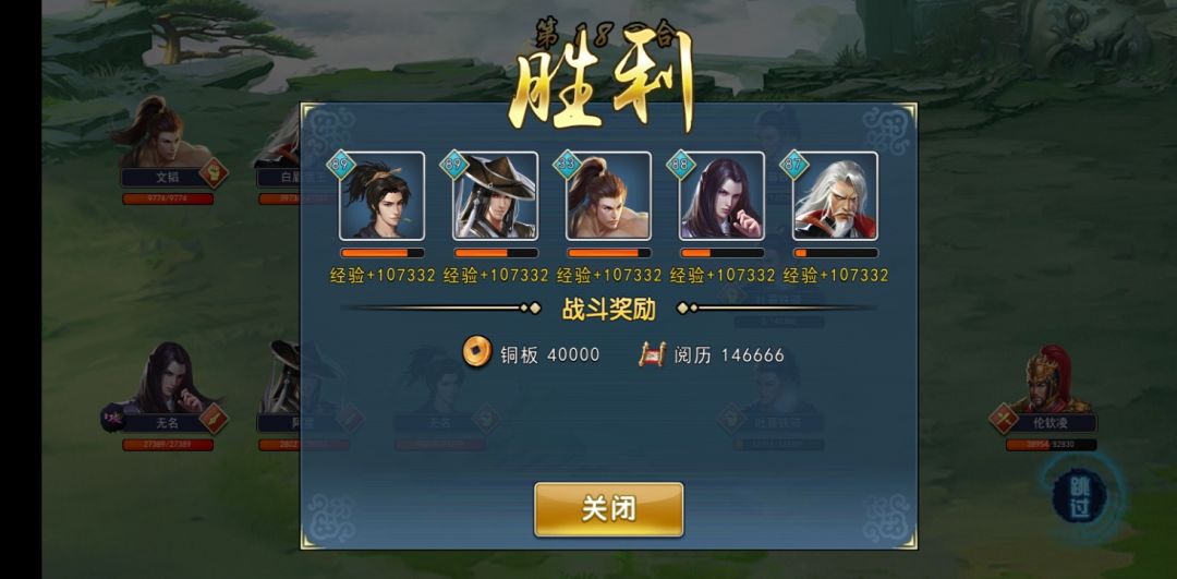 如图,伦将军阵型为113,下路三个武功分别为弹指神通,独孤九剑,血魔神刀。上面两个士兵高反震,极高防御(甚至完全免伤)