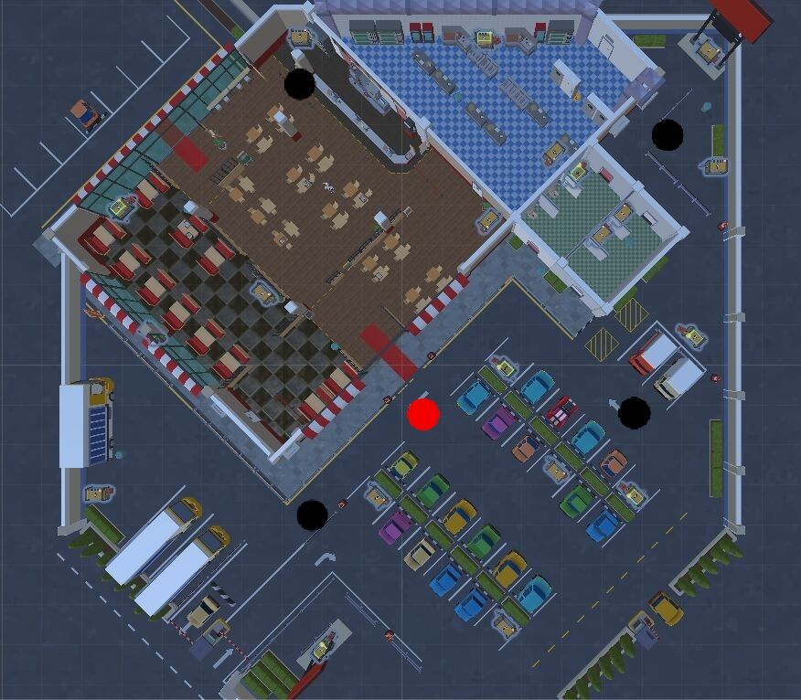 如图,这是我自己总结出来的出生点,红色的点是守夜者,黑色的点是逃生鸡 排除了一些特别迷的出生点之外,一般的话, 出生点都是以守夜为中心,逃生鸡在四周的规律刷新。一般总有一个刷的离守夜特别近,如果开局守夜就找到你,就往最近的板区跑,尽量拉距离,有条件的话可以拿一个炸弹自保。这时候就尽量往队友少的地方带守夜,不干扰队友修机,就算被拍倒了,守夜再去找你队友的时候,也会消耗很长时间。这个时候就可以给队友时间来救你。 如果被救下来的时候警报响了,但周围已经没有板子了,就可以搏一搏躲进箱子里,反正没有板子也溜不了多久,如果守夜去追队友了,那收益还是不亏的🤠
