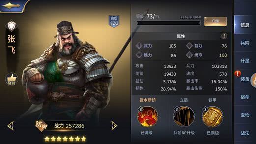 张飞身为步兵将,天生兵多盾厚,五星以后,技能更是0冷却。也就是说张飞的技能从第一回合开始,只要不被控制,一直释放到最后,相当强大的一个技能。