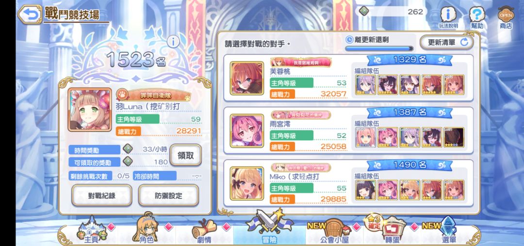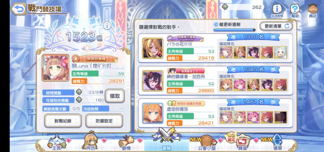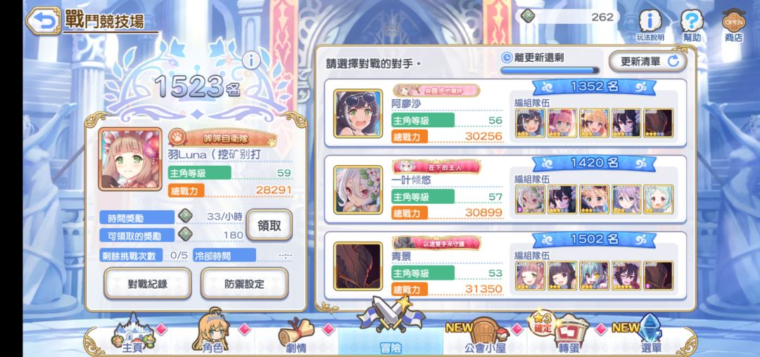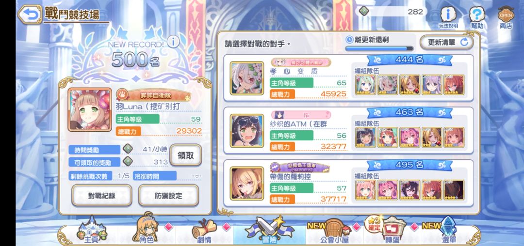 什么?上面两队都没有,那就憋一会竞技场,什么是憋竞技场?这个游戏的竞技场还有公主竞技场是分区的,也就是说不是所有人都在同一个场里排名的,跟你同一个竞技场的都是和你差不多时间入坑的玩家。机制是每隔一段时间会开一个新的竞技场,如果你一直没有打Normal模式的4-6的话你的竞技场就不会解锁,而在竞技场取得高排名会有很丰富的排名奖励,一个场打完有3W水晶吧大概是,所以你可以在主线推到4-5的时候停手,然后打活动本提升练度,练一队适合竞技场的队伍,然后在竞技场开新场的当天解锁竞技场,此时里面基本全是npc,然后一直打,次数不够就用水晶买次数,一次性挖完,这样就能得到所有的奖励了。至于怎么知道新竞技场什么时候开,一个是留意NGA之类的论坛,会有人说的,另一个就是自己每天几次在好友检索里看看一下,检索一下和26~35这个区间内一小时内有登陆的人的竞技场是什么时候开的,那差不多就是最近的场了(引用自给最近入坑的新手的配队参考)。憋到新场开了,尽量选AOE伤害足的角色,如511,智,nnk之类的打人机就好了,不过抽完圣伊池和fes还有春田,这两个常驻居然一个都没抽到那也蛮非的.....