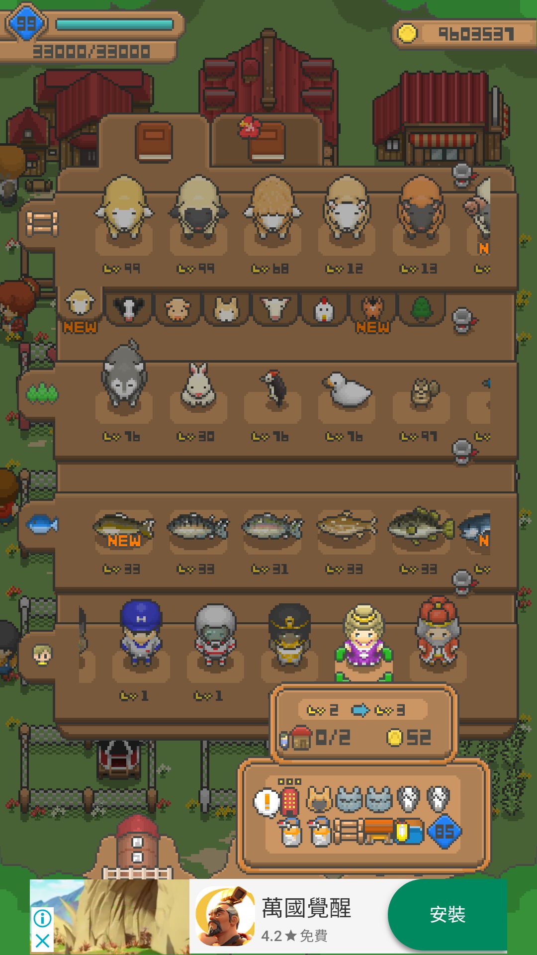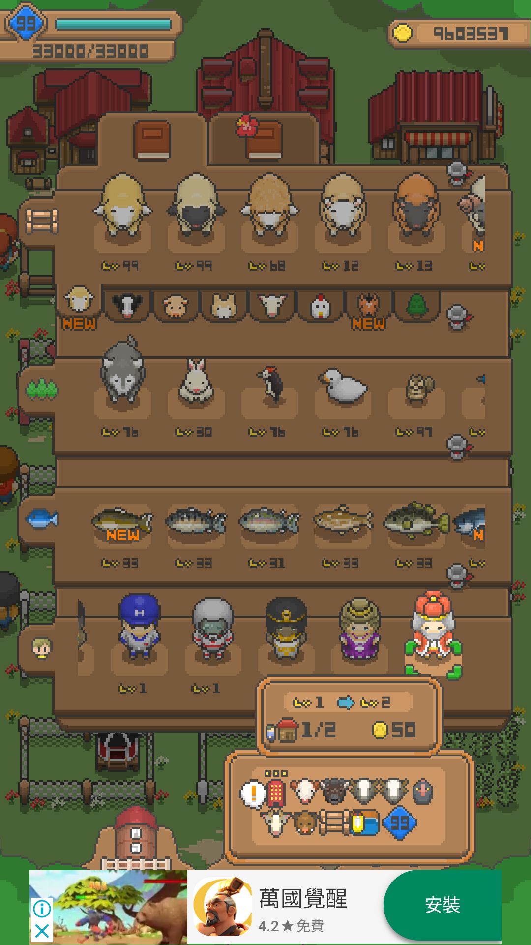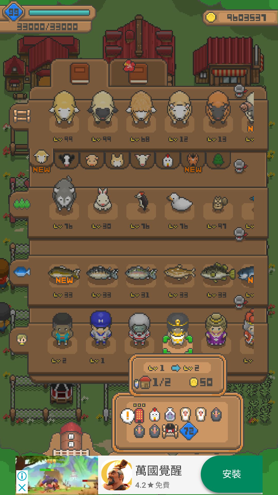 (高額頭羊+褐羽黑尾雞+土毛賽馬+雞舍+馬殿+LV 36)