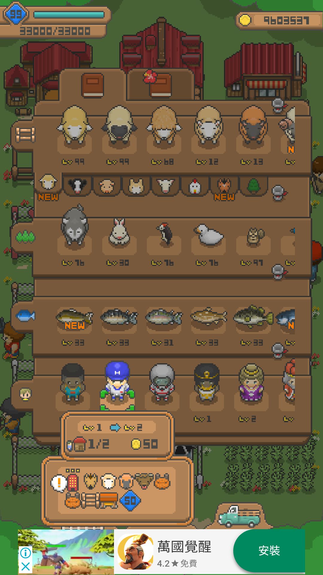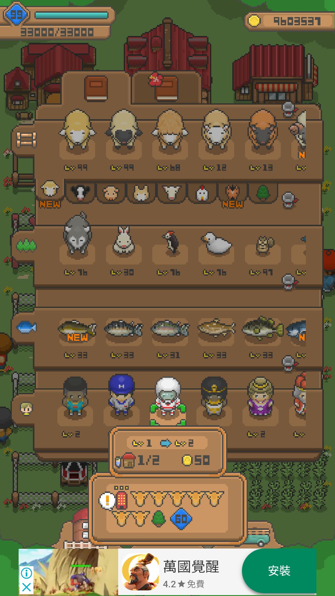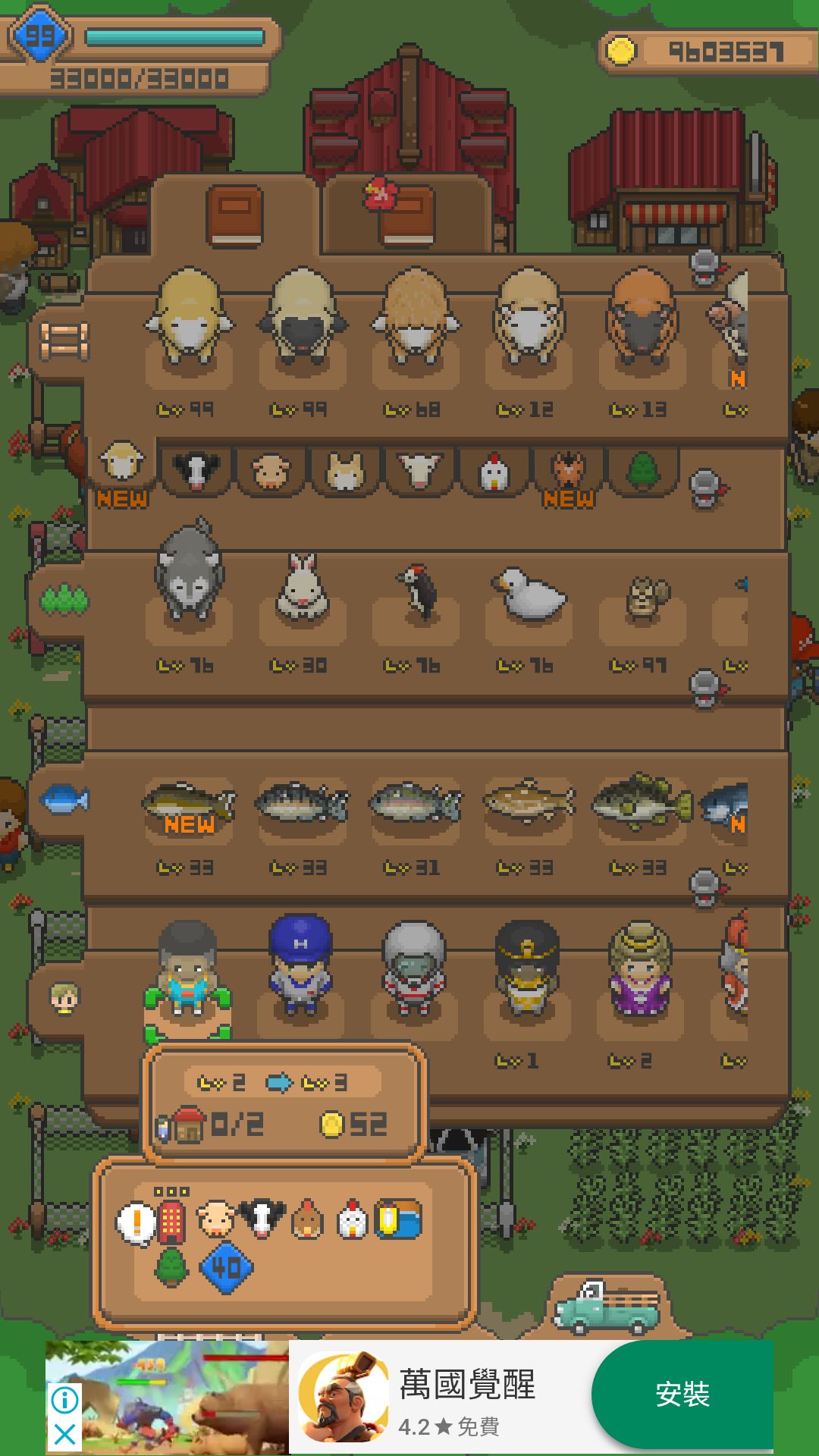 (高額頭羊+褐羽黑尾雞+土毛賽馬+雞舍+馬殿+LV 36)