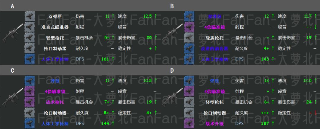 重点提一下没有放在推荐图的强化枪.托,未作推荐不代表它不强,只是因为Uzi的枪.托,乃至整个Uzi模组,是吃钢大户。对钢板的消耗量是很高的。强化枪托的优势个人认为在于加伤害和加攻击距离,在一定程度上可以补偿双弹鼓等带来的距离削减。