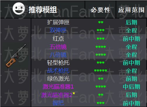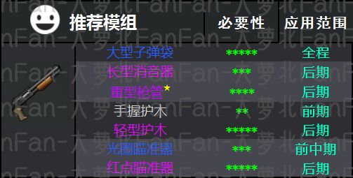 大型子 弹袋,其优势在于大致融合了前两个模组的优势。增加射速、伤害,本身耐久就不算高的猎 枪,也可以加上2点耐久。
