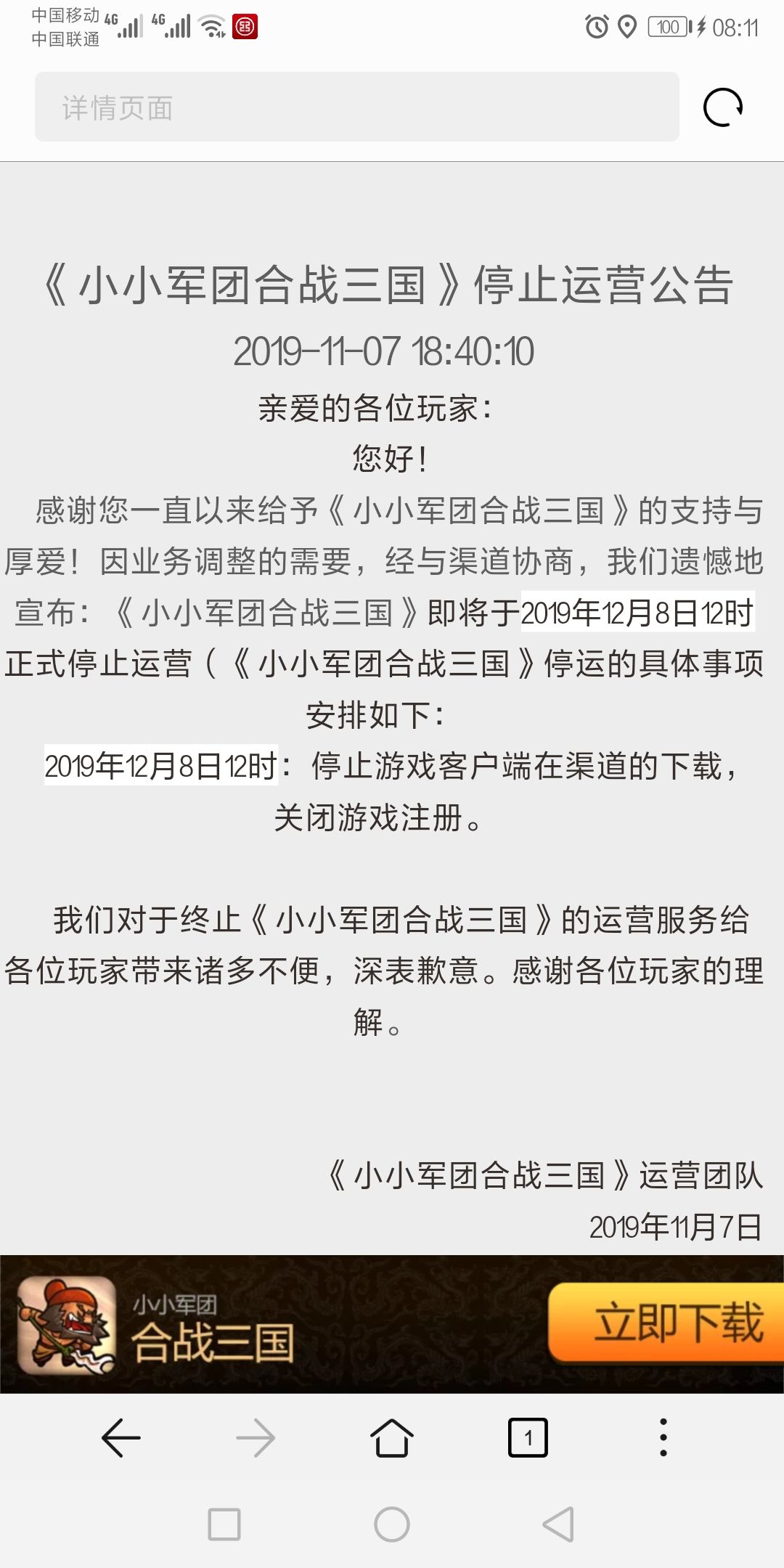 你好,看到好多地方说合战三国12月停服了,这个是真的假的?最近准备回归,查了下,好像只有TapTap没关